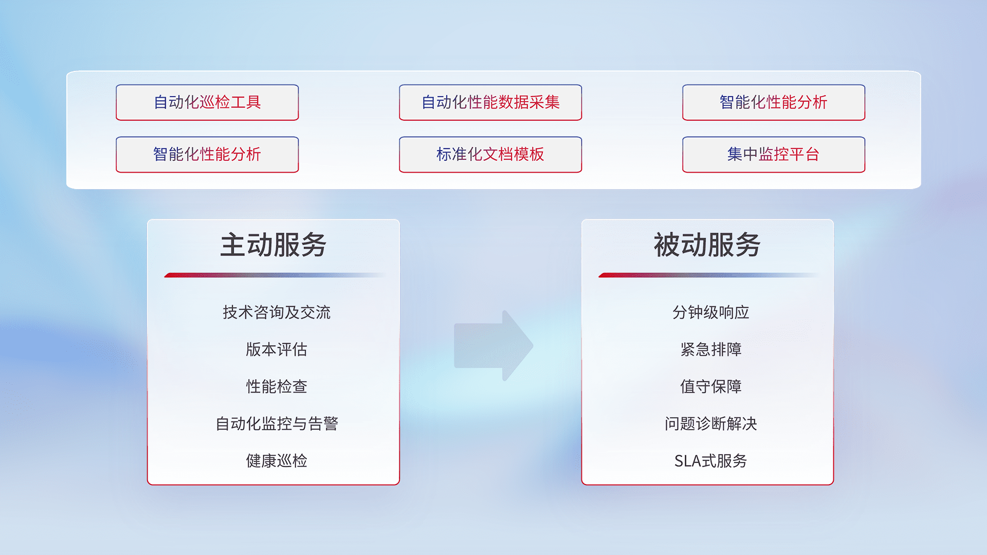 智能化工具和标准化文档,,,保障服务质量,,提供主动服务(包含技术咨询、、、版本评估、、、、性能检查、、、、自动化监控与告警、、健康巡检)和被动服务包含(分钟级响应、、、紧急排障、、、、值守保障、、、、问题诊断解决、、、、SLA服务)。。。